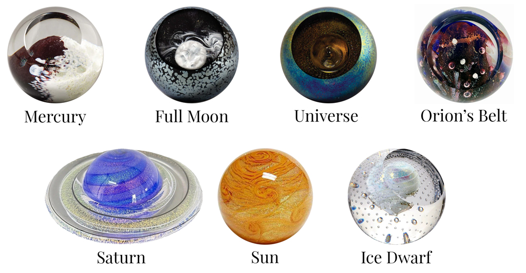 Inspired by the designer's interpretation of the solar system, each weight takes a team of 2-3 artists to create. These carefully formed designs use a wide spectrum of specialty colors, dichroic glass, glow material, and precious metals.